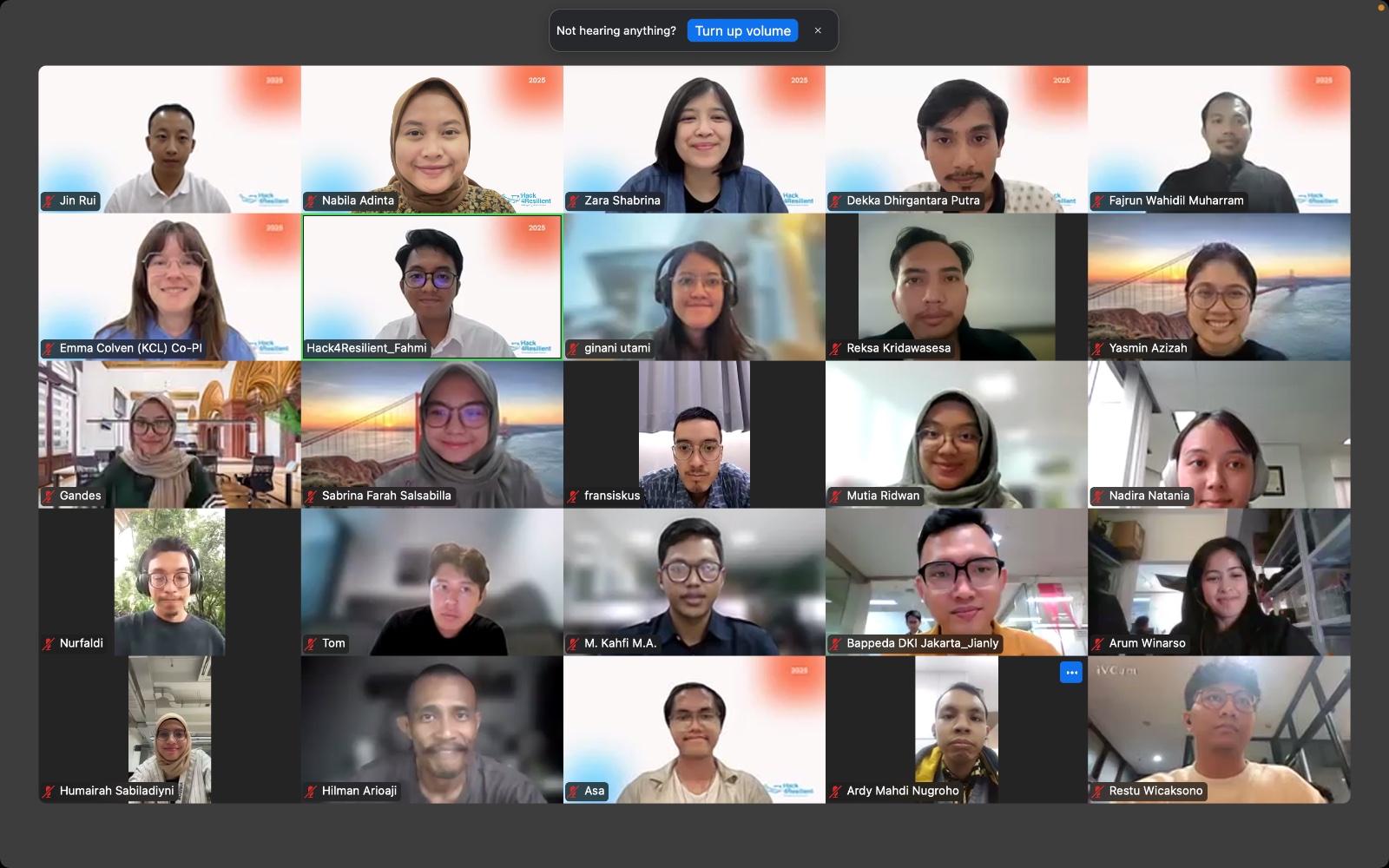 Untuk memperluas dampak dari hasil penelitian tersebut, KCL, RDI, dan ITB berkolaborasi dengan Bappeda Provinsi DKI Jakarta menyelenggarakan hackathon bertajuk Hack4Resilient Jakarta: Reimagining Urban Futures. Kegiatan ini berlangsung pada 19–21 Agustus 2025 dan berhasil menarik perhatian luas dengan total 141 proposal yang masuk, dari peneliti, akademisi, mahasiswa, hingga praktisi. Dari jumlah tersebut, hanya 14 tim yang terpilih untuk melanjutkan ke tahap mentoring intensif.